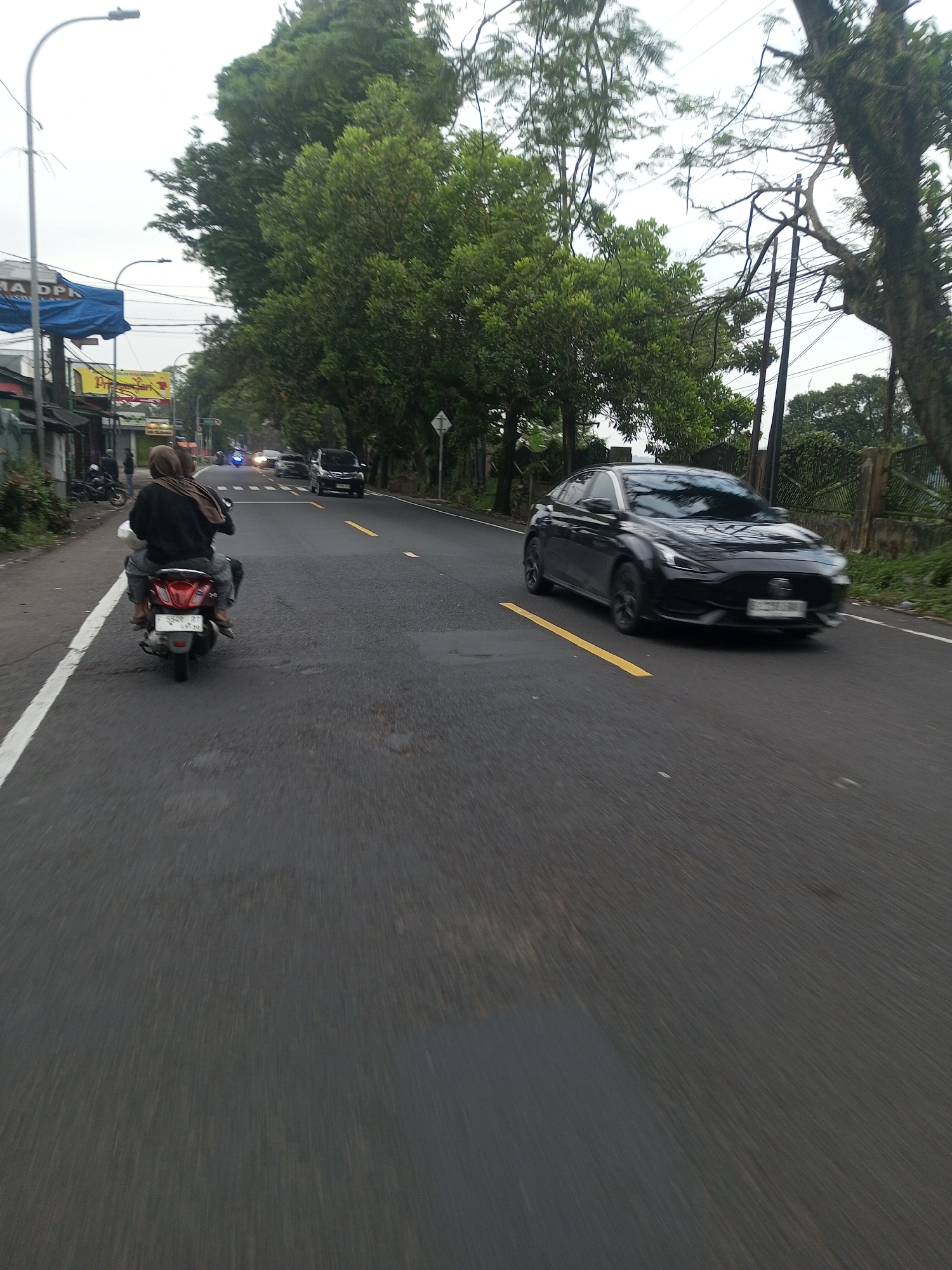 road in Ciherang, Indonesia. A black car is driving on the right side of the road, while a motorcycle with two riders is on the left side. There are other vehicles further down the road. Trees line the sides of the road, and there are buildings visible in the background. The sky appears overcast.