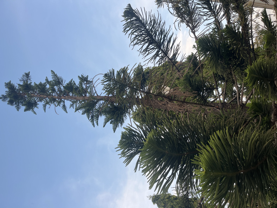 A low-angle view showcases lush green pine branches against a serene blue sky