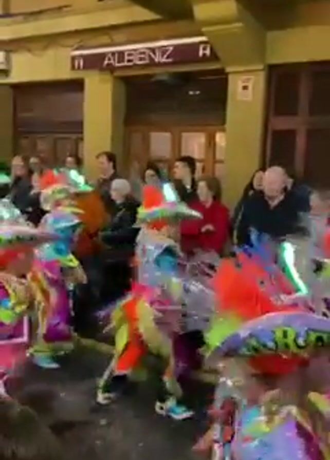 group of people in vibrant, colorful costumes dancing in the street during what appears to be a parade or festival. The costumes are adorned with geometric patterns and bright, neon-like colors, with some including illuminated elements. They are dancing in sync to the music, which includes a rhythmic drumming beat. Spectators line the sides of the street, watching and enjoying the performance. A building with a sign that reads "ALBENIZ" can be seen in the background. The lighting indicates it is nighttime or early evening.