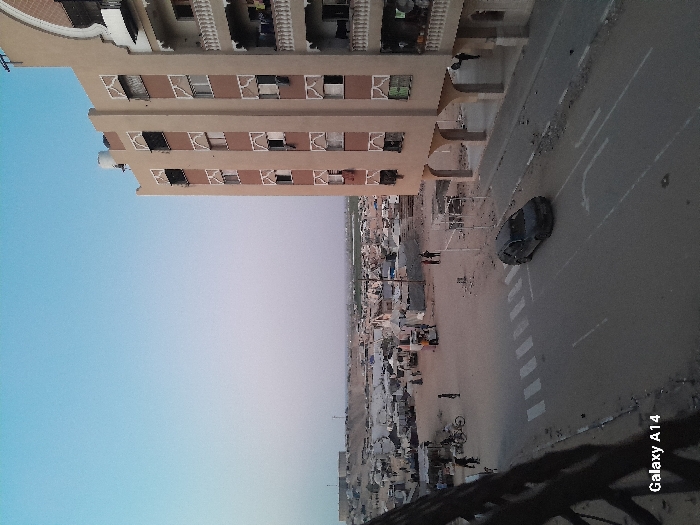 The image captures an elevated view of a street scene in Khan Yunis, Palestinian Territory, during daylight hours, possibly late afternoon or early morning, under a light blue sky