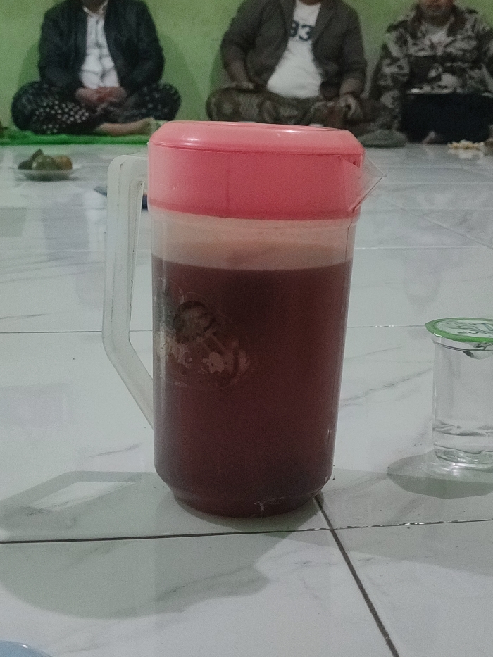 red liquid in a clear pitcher with a pink lid and a clear handle. There is a clear glass with a green lid and a white liquid to the right of the pitcher. The background shows three men sitting on a light-colored tiled floor. They are wearing various clothing, and the two visible men have their arms crossed. The men appear to be of an older age. The setting is a tiled room in Kecamatan Pandaan, Indonesia, with coordinates -7.668, 112.724. The tiled floor is made of rectangular white and gray tiles. The pitcher is sitting on the tiles in the center of the image. The glass is to the right of the pitcher. The men are in the background, and their faces are not visible. The light is coming from the left side of the image.