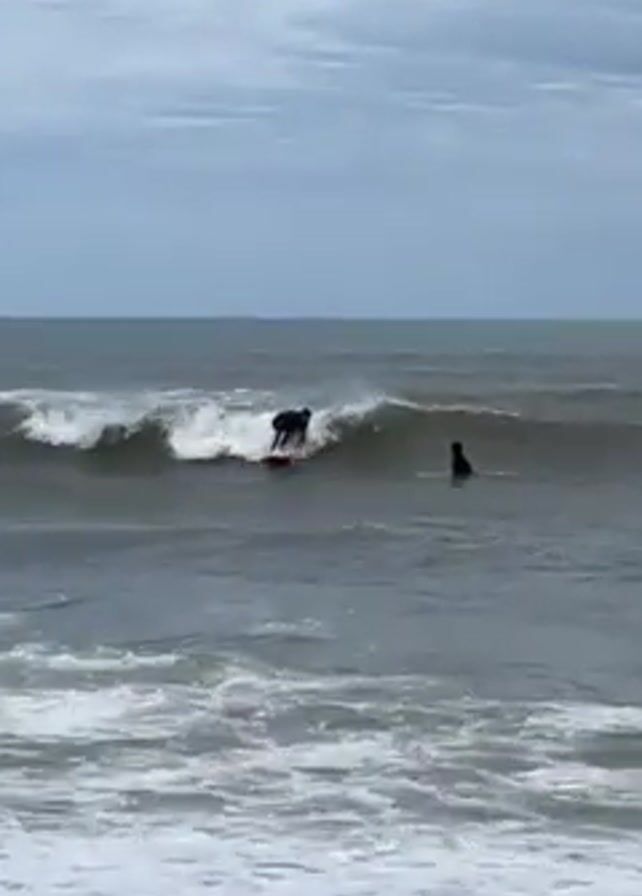 beach scene with several people surfing in the ocean. The beach has light brown sand, and the ocean waves are choppy with white foam. The sky is mostly cloudy. One surfer, dressed in black, rides a red surfboard. He is shown standing with his arms outstretched, before falling off the board. Another surfer is seen sitting in the water nearby. The camera view is static, positioned on the beach.