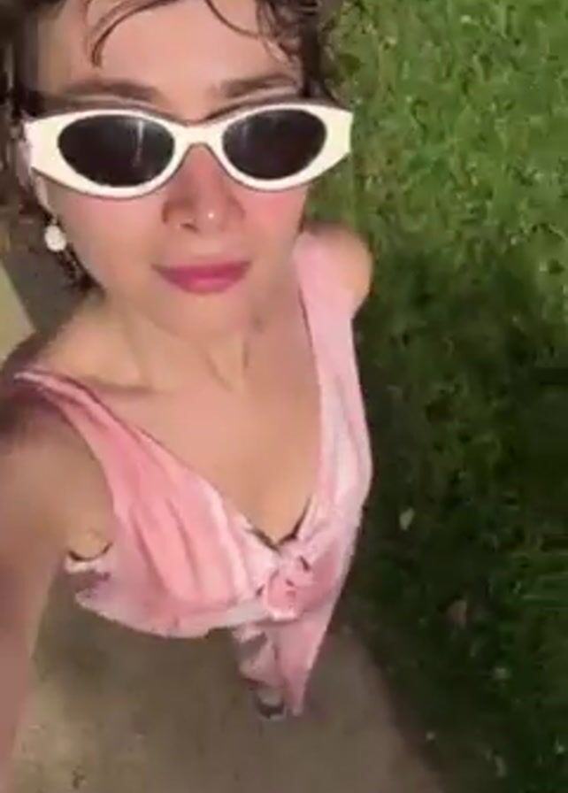 A woman is videoing herself walking down a path in a park. She is wearing white sunglasses, a pink dress, and earrings. Her hair is curly and wet. She is holding a white cloth in her hand. The park has grass and trees. The path is made of dirt and gravel. The sun is shining.
