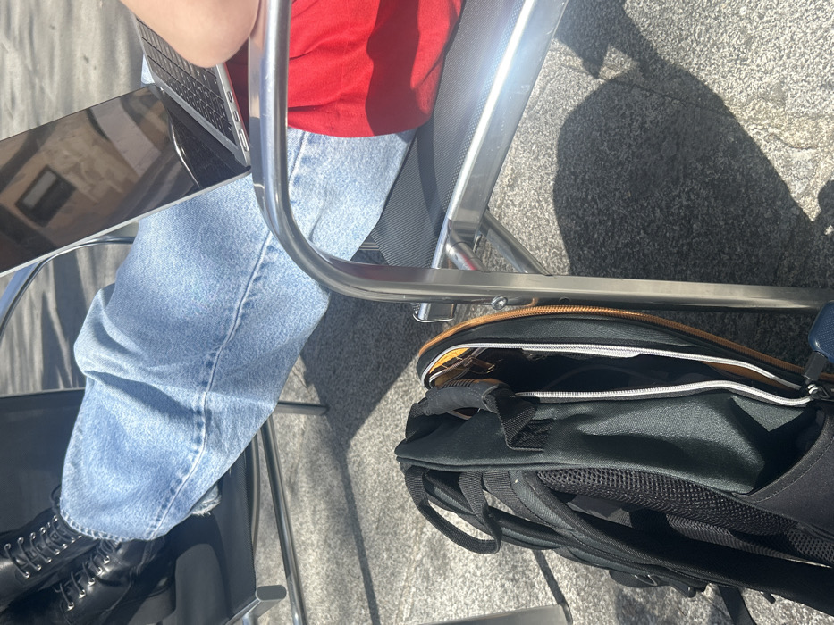 A person, wearing blue jeans, a red shirt, and black boots, is sitting in a metal chair with their legs propped up on another chair. They are using a laptop computer. A black backpack with orange accents is sitting on the ground beside the chair. The scene is in Segovia, Spain, specifically at the coordinates 40.953 latitude, -4.118 longitude. The ground is rough and gray, made of paving stones. The chairs are metal and are partially in shadow. The person is not visible from the waist up.