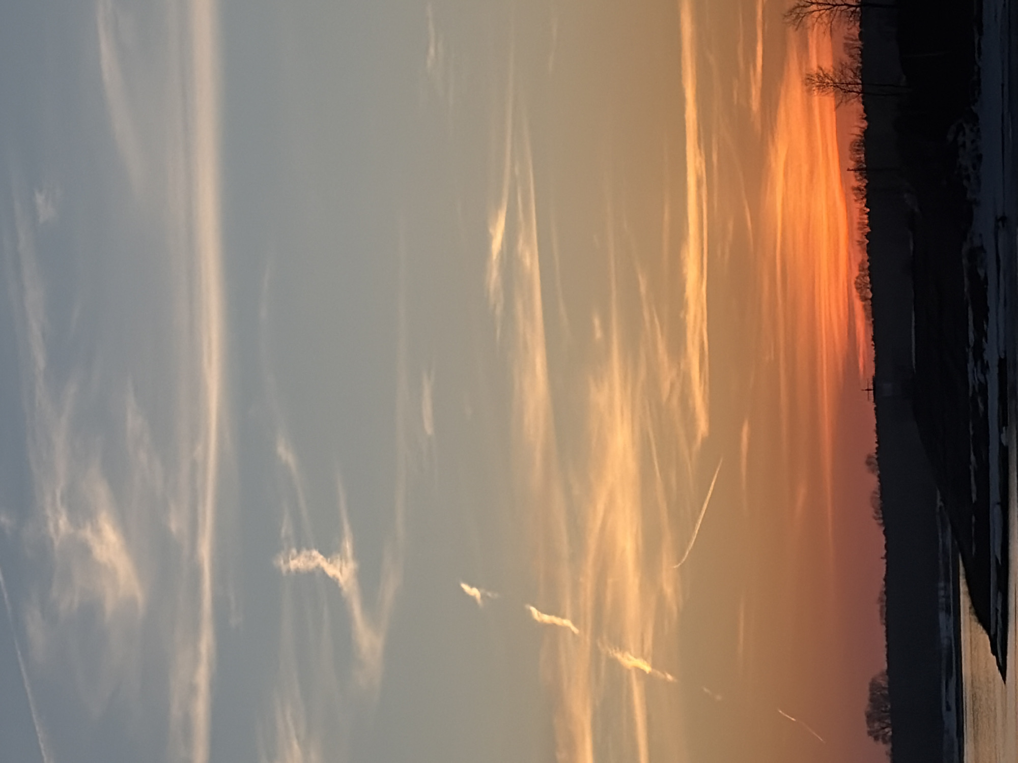 sunset in a location that may be near Chaikovsky, Russia. The sky is predominantly blue and transitions to orange near the horizon. Linear clouds stretch across the sky, reflecting the colors of the sunset. Along the horizon, there is a dark treeline, and potentially a body of water or land in the foreground. The image is rotated 90 degrees.