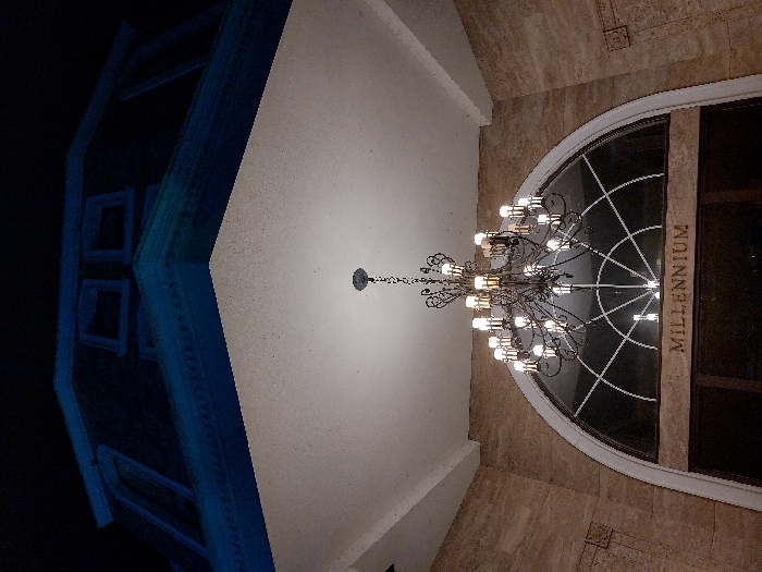 This nocturnal image captures the illuminated entrance of the Millennium building in Sveti Vlas, Bulgaria. A large, ornate dark metal chandelier, equipped with multiple lit, candle-style bulbs, hangs centrally from a white, textured ceiling overhead. Directly below the chandelier, a prominent arched window, featuring white decorative grilles, is positioned above a darker, recessed entranceway. The word "MILLENNIUM" is inscribed in capital letters on a light-colored stone lintel located immediately above the entrance. The building's facade surrounding the entrance is constructed from light-toned, veined stone, incorporating recessed decorative panels. Above the brightly lit entrance area, a dark blue/teal roof structure with visible dormer windows is silhouetted against the dark night sky. No individuals or specific actions are present within the frame.