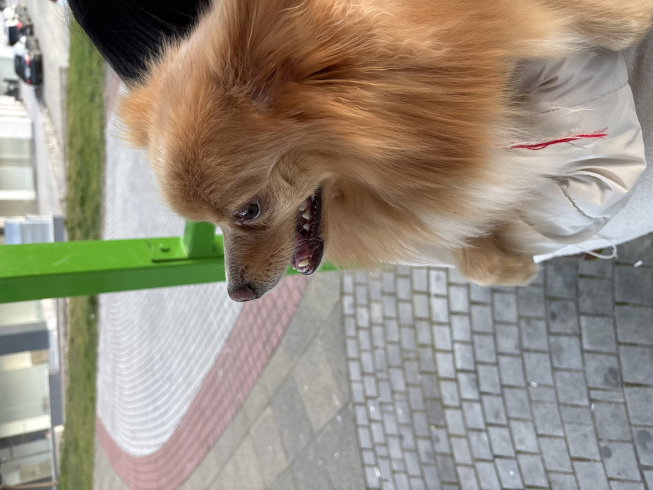 A small, light brown, long-haired canine, consistent with a Pomeranian-type breed, is depicted in profile, facing left with its mouth slightly open, revealing teeth. The dog is positioned on the lap of an individual, whose upper body and a light-colored, possibly beige or white, padded garment are partially visible in the lower right foreground. A thin red string or thread is visible hanging from the dog's fur near this garment. To the left of the canine, a vertical, bright green metal pole or support structure is present. The ground beneath and to the left of the subjects is paved with light grey rectangular interlocking bricks, arranged in patterns, including a distinctive curved section with reddish-brown bordering pavers. Beyond the paved area, a strip of green grass is visible, followed by a street lined with multiple parked dark-colored vehicles. In the background, modern multi-story buildings featuring large windows are discernible. The scene is an urban outdoor environment in Kardzhali, Bulgaria.