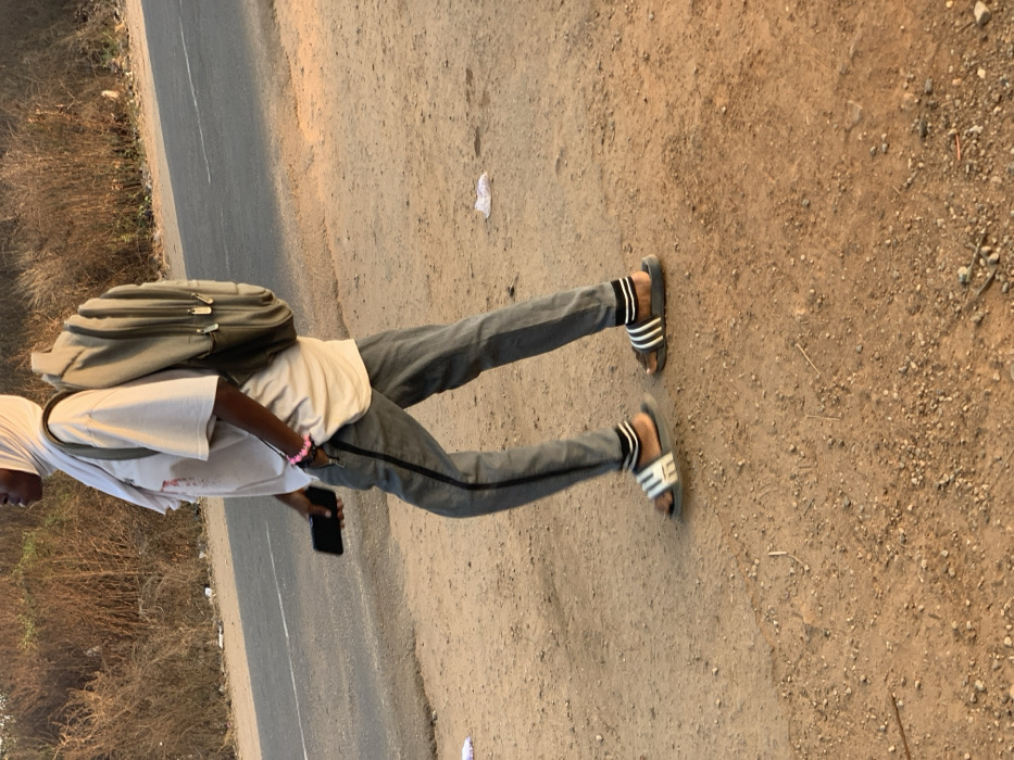 A person stands in profile next to a road. They wear grey jeans, a white shirt, a backpack, and striped sandals. They hold a black phone in their hand. The road is asphalt, and the ground next to it is dirt and small rocks. Vegetation appears in the background. A small piece of white litter lies on the ground. The picture is rotated clockwise.