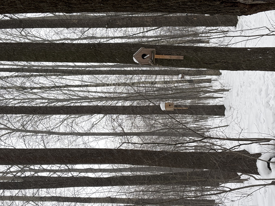 This image depicts a snowy wooded area in Kudrovo, Russia, characterized by numerous bare trees with predominantly dark, vertical trunks. The ground is uniformly covered in fresh snow, exhibiting faint footpaths. A light, overcast sky is visible through the tree canopy, and small snowflakes appear to be falling or suspended in the air. In the mid-ground, three wooden birdhouses are affixed to tree trunks at varying heights. The most prominent birdhouse, located in the right-middle, is a light brown wooden structure with a sloped roof lightly dusted with snow. A small, dark-feathered bird, possibly a titmouse or sparrow, is positioned at its circular entrance hole, facing into the structure. A second birdhouse, similar in construction, is visible in the left-mid ground, also mounted on a tree trunk, with snow accumulated on its roof. A third, smaller birdhouse is partially visible further back, between the first two, also mounted on a tree. The environment suggests a cold, winter day with recent or ongoing snowfall.