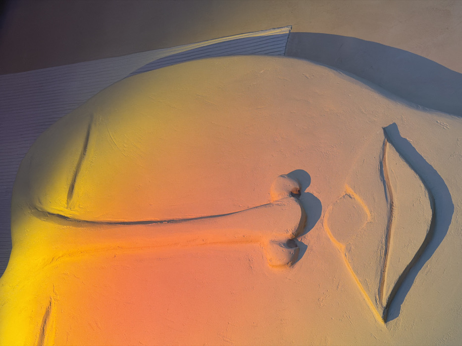An overhead view reveals a stylized, textured sculpture or relief art piece. A large, rounded form occupies the majority of the frame, cast in a gradient of yellow to orange. Extending across its surface is a raised, bone-like shape, punctuated by circular depressions. To the right, a curved, leaf-shaped element is also carved into the textured material. Shadows define the edges and contours of these forms. The overall aesthetic is abstract and minimalist.
