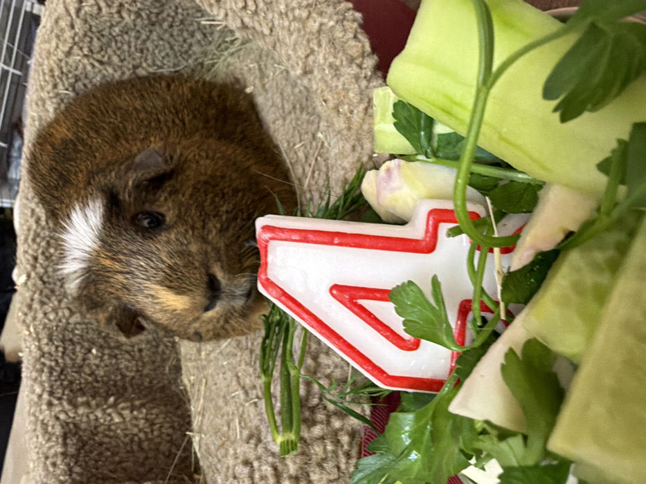 - "An tri-colored guinea pig with brown, tan, and a prominent white patch on its forehead, and dark eyes, is seated on a textured, light brown, fluffy surface containing hay" by FM-vetpu1, licensed under CC BY 4.0