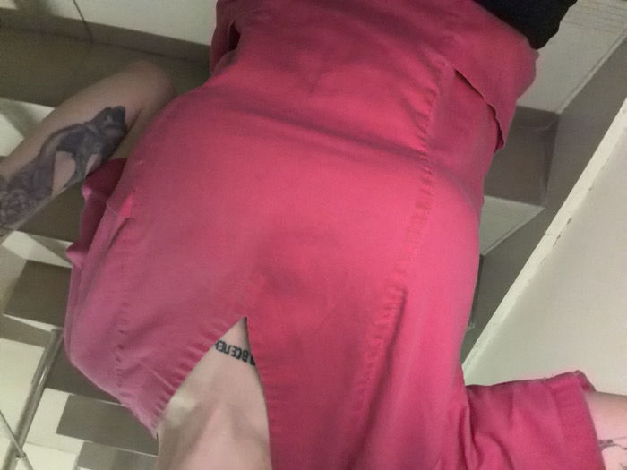 A partial view of an individual, likely female, is captured on an indoor staircase. The subject wears a pink V-neck short-sleeved scrub top. A tattoo displaying partial Cyrillic text, "ВСЕЛЕН", is visible on the upper chest. The left forearm bears a large, dark, intricate tattoo. The lower body is partially visible in black fabric. The background consists of a light-colored staircase with light-colored steps and dark risers, a light wall to the left, and a metallic handrail to the right. The specific location in Surgut, Russia, cannot be identified from the visual details provided.