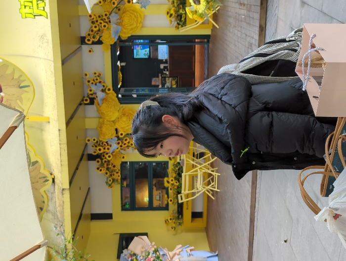 The scene is located in an outdoor commercial area within Shapingba District, China. A young female, appearing to be a pre-teen or teenager, is positioned in the mid-ground, facing right in profile. She wears a black puffer jacket with a neon green emblem on the left sleeve and has dark hair tied in a ponytail. A checkered bag is visible behind her right shoulder. On the paved ground in front of her are multiple shopping bags: two large brown tote bags, one of which contains items within a white plastic bag, and a light pink gift bag with white and gray braided handles. To the far left, a large bouquet of flowers wrapped in light blue paper is partially visible. The background features a bright yellow building, possibly a café or retail establishment, adorned with numerous artificial yellow sunflowers and light blue butterfly cutouts. Chinese characters, including "琴" (Qín), are visible on its facade. An open doorway leads to a dark interior with a counter and display. In front of the building, on a raised wooden deck, are several yellow metal outdoor tables and chairs. A large, light-colored awning extends over the upper portion of the frame.