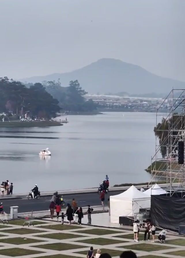 lakeside view with a mountain in the background under a cloudy sky. A body of water is visible, with a swan-shaped boat drifting on it. Adjacent to the water is a road with pedestrian and vehicle traffic. People are walking along the road and there are a few parked vehicles, including a white van. To the right, there's a structure with scaffolding, possibly for a stage or event setup, next to some white tents. In the foreground, there's a paved area with a geometric pattern and people sitting and standing around.