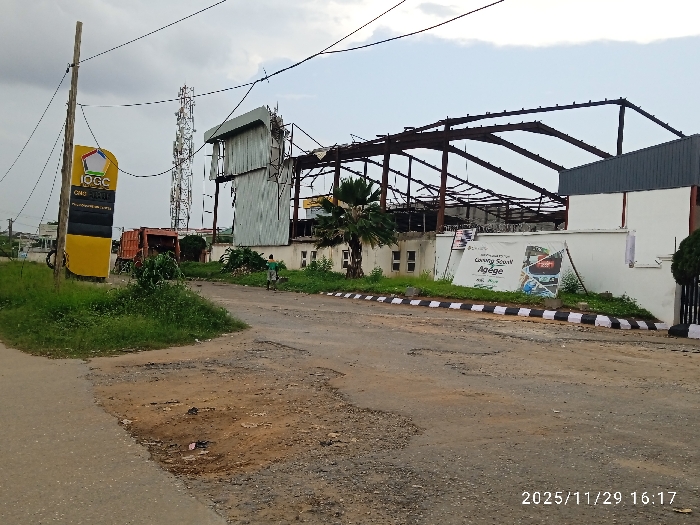 The image displays a daytime street scene, likely in Agege, Lagos, Nigeria, given the "Luxury Smart Agege" banner visible on a building. The timestamp "2025/11/29 16:17" is embedded in the lower right corner. In the foreground, a heavily worn, unpaved road surface with numerous potholes and patches of exposed dirt extends towards the background. A small patch of green grass is present on the left side of the road. On the right, a white curb with black diagonal stripes separates the road from a property. On the left side of the frame, a tall wooden utility pole stands, supporting multiple overhead wires. A yellow and black sign, reading "IOGC" with a pentagonal logo and "CMN-TECH" below it, is affixed to this pole. Behind the sign, a portion of an orange-red truck, possibly a tipper truck, is visible, parked off the road. Towards the center-right, a large building structure is prominent, appearing to be in a state of partial demolition or construction. The roof and substantial sections of the upper walls are absent, exposing an extensive dark metal framework. Beneath this framework, a segment of a white-painted wall with small, dark rectangular windows is visible. To its immediate right, another section of the building features corrugated metal siding. In front of the white wall, two large banners are displayed. One banner, oriented diagonally, features "Luxury Smart Agege" text and depicts various interior design images. A single individual, dressed in a light green shirt and dark trousers, walks away from the camera on a dirt path alongside the road, moving towards the right side of the frame. A palm tree is situated near the white wall. On the far right, a dark metal gate with vertical bars is partially visible. In the background, a tall, grey telecommunication tower with multiple antenna arrays is visible behind the partially constructed building. The sky above is overcast with a uniform grey cloud cover.
