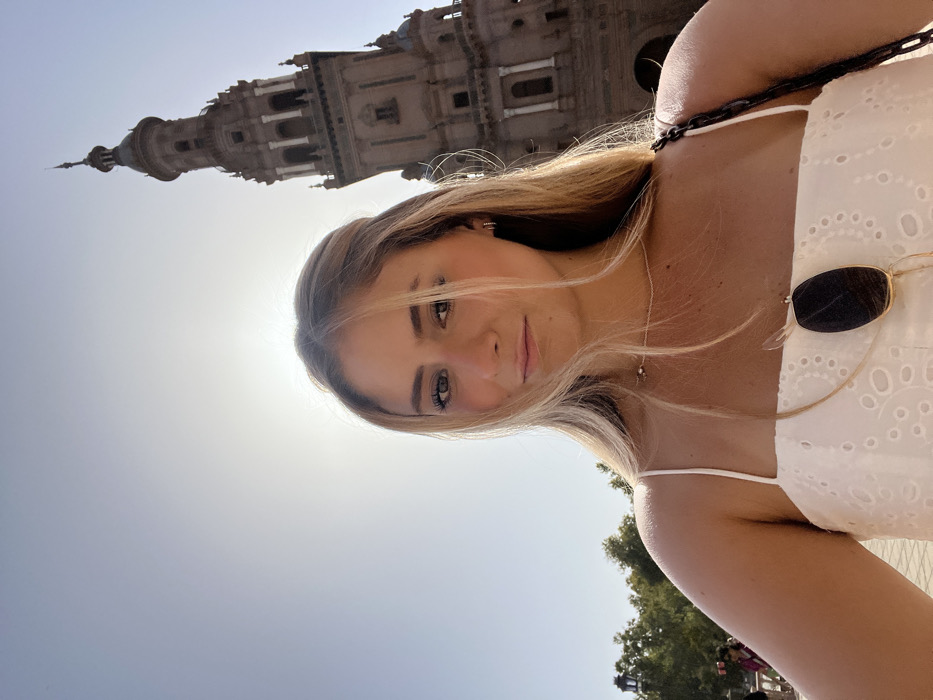 A blonde woman, approximately 20-30 years old, is depicted in a close-up selfie taken outdoors under bright sunlight. She looks directly forward with a slight smile. Her hair is styled half-up, with loose strands framing her face. She wears a white, eyelet-embroidered, spaghetti-strap top, a thin gold necklace, and small hoop earrings. Dark-lensed sunglasses with gold frames hang from her neckline. In the background, dominating the right side of the frame, is a multi-tiered, ornate stone tower featuring arches, columns, and a domed spire. This architecture identifies the location as the Plaza de España in Seville, Spain. The sky is clear and light blue, with a strong light source positioned behind the subject, causing lens flare. Blurred foliage, a lamppost, and distant figures are visible on the left.
