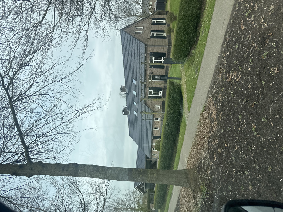 The image displays an exterior view of a residential property in Oploo, Netherlands, on an overcast day. The perspective is from ground level, likely from a vehicle, with a portion of a dark vehicle mirror visible in the lower-left corner. In the immediate foreground, a strip of dark, tilled soil with scattered dry leaves and sparse green growth occupies the bottom of the frame. Above this, a light grey paved pathway or sidewalk runs horizontally. To the left of the path, a large, mature deciduous tree trunk with light grey-brown bark stands vertically, its bare branches extending upwards and across the sky, partially obscuring the background. The midground is dominated by a long, multi-section brick building, likely a renovated farmhouse, featuring dark reddish-brown bricks and a dark grey tiled gabled roof. The roof is equipped with at least four rectangular skylights and two dark grey chimneys. Multiple windows with white frames are visible, many featuring dark green closed or partially open shutters. The main section of the building has a central entrance flanked by tall dark green shutters and two black vertical posts standing in front. To the left of the main structure, an attached or adjacent smaller building with a similar roofline has a large, open bay or entrance, revealing a dark interior and what appears to be solar panels on its roof. The property is bordered by neatly trimmed dark green hedges and a section of green grass. A paved entrance path leads from the sidewalk towards the main building. The background consists of more bare deciduous trees and branches against a light grey, uniformly cloudy sky. A portion of another residential structure with a dark roof is faintly visible through the trees on the far right. No individuals, animals, or discernible actions are present in the scene.