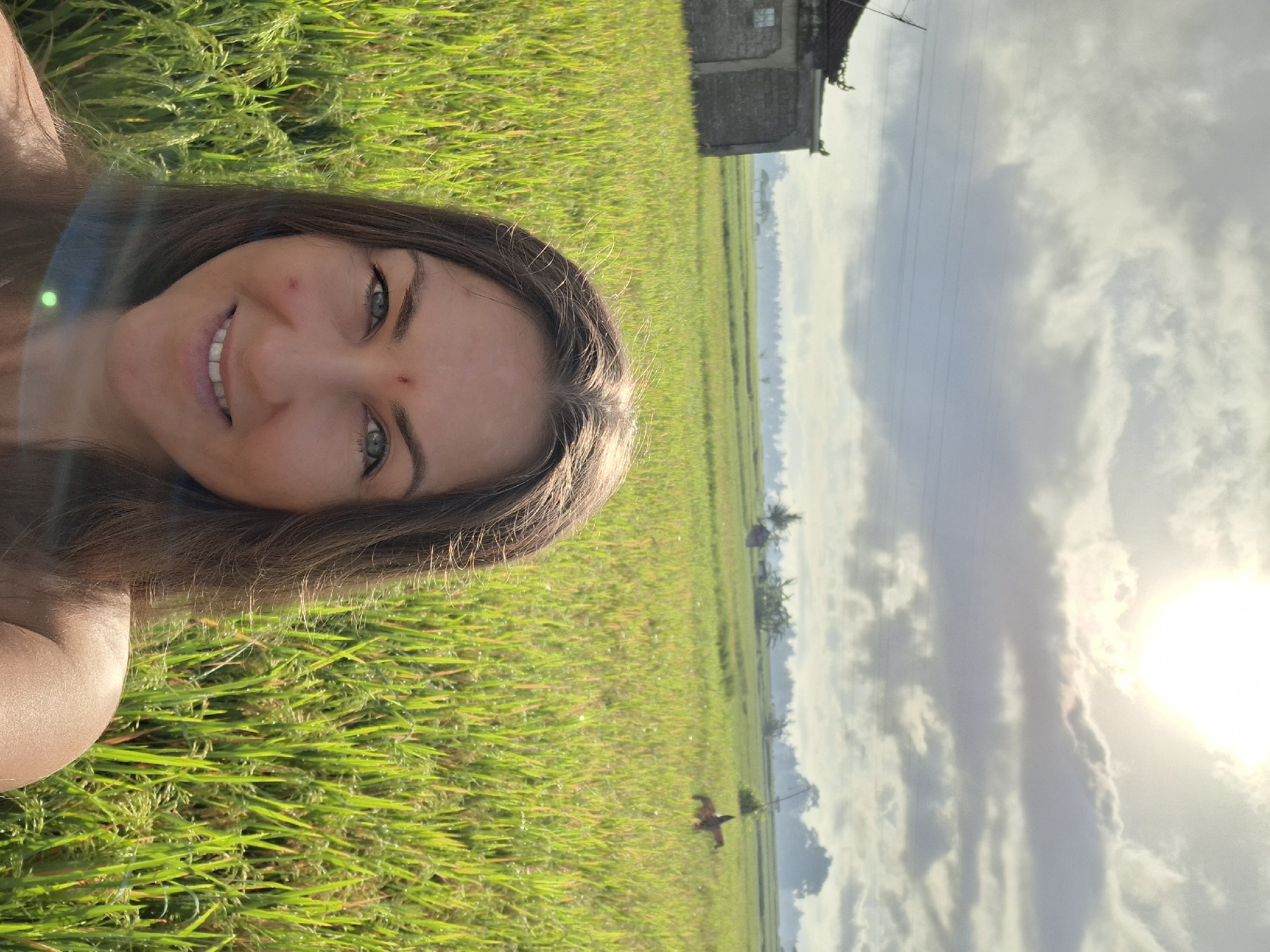 woman in a field. The woman has long brown hair, fair skin, and green eyes. She is smiling at the camera. There is a small red mark on her forehead. In the background is a rice field in Lodtunduh, Indonesia. The rice field is green and lush. There is a building in the distance. The sky is cloudy, and the sun is shining brightly. There is a bird in the middle-ground, flying over the rice field.