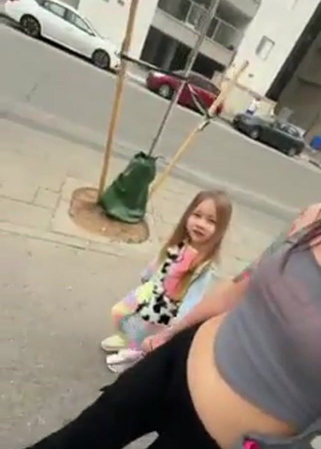 A woman with a tattoo on her arm walks down the sidewalk with a young girl. The woman holds the girl's hand as they walk. The girl smiles. The girl is wearing a cow-print, tie-dye sweatsuit. The woman is wearing a grey top, black pants, and eyeglasses. The background shows a city street with cars and tall buildings.
