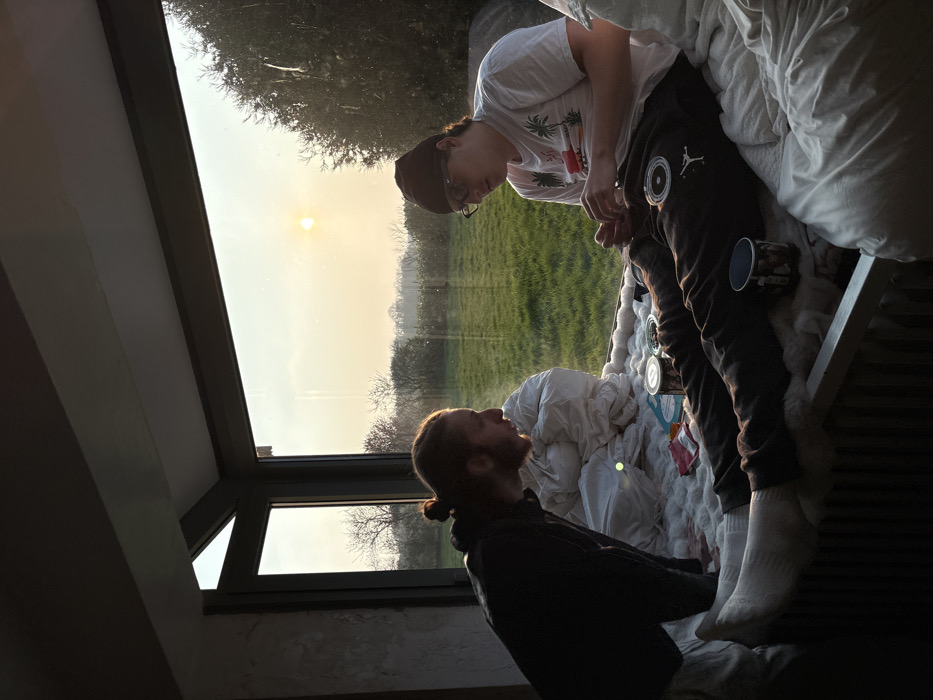 The image displays an indoor scene in Bû, France, featuring two males positioned near a large window that overlooks a grassy field with trees under a low sun. The male on the left, with reddish-brown hair tied in a bun and a beard, wears a dark hoodie and light pants, leaning forward towards the other individual. The male on the right is seated on white, padded bedding, wearing a black beanie, eyeglasses, a white t-shirt with a palm tree graphic, dark sweatpants with a circular logo, and white socks. He is actively manipulating small objects with his hands. Various items, including small containers, a red packet, and a dark mug, are present on the bedding between the two subjects. The setting sun is visible through the window, casting a golden light across the scene and the outdoor landscape.