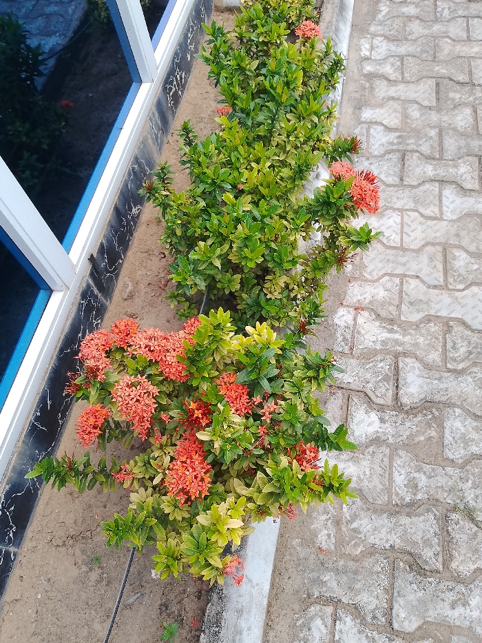 The image displays an outdoor scene in Lokoja, Nigeria, depicting a landscaped area alongside a building. On the left, a portion of a building façade is visible, featuring large, dark-tinted or reflective windows with white frames. Beneath the windows, a dark, possibly black, textured wall panel runs horizontally, bordering a strip of light brown soil. This soil bed, positioned centrally, contains several healthy, dense shrub-like plants identified as Ixora. These plants exhibit vibrant green leaves, with some foliage displaying lighter, yellowish-green variations. Numerous clusters of small, brightly colored reddish-orange flowers are prominently featured on the plants. To the right, a paved walkway extends, constructed from interlocking grey concrete pavers arranged in an 'I' or 'H' shape pattern. The scene is devoid of human presence or activity.