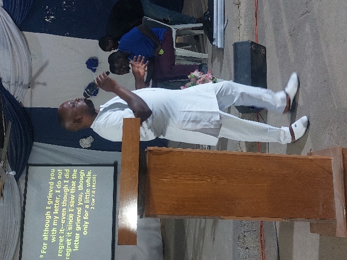 A man in a white suit and shoes stands behind a wooden podium, holding a microphone and gesturing with his other hand. Behind him, a projector screen displays a biblical verse: "For although I grieved you with my letter, I do not regret it..." Two people sit behind him, and a speaker is also visible in the background.