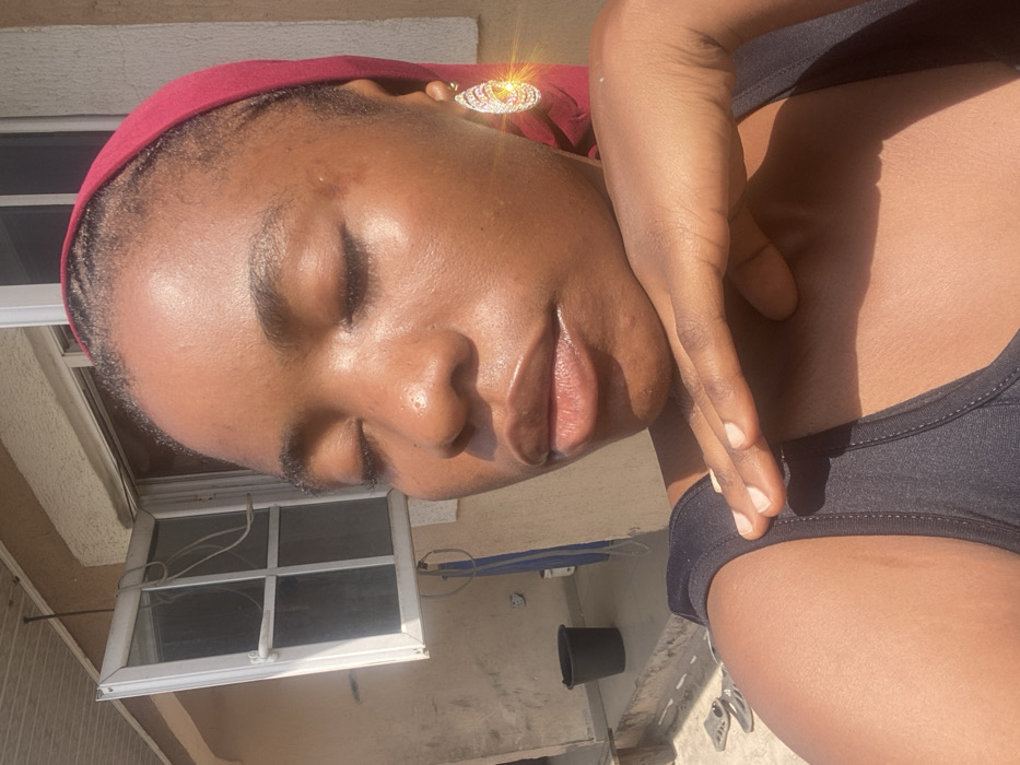 A young adult female is depicted outdoors in Zango-ndaji, Nigeria, under direct, bright sunlight. Her eyes are closed, and her head is slightly tilted. She wears a dark red head covering, exposing a visible hairline of tightly styled hair. A black tank top covers her torso. On her visible right ear, she wears a large, sparkling teardrop-shaped earring. Her right hand is positioned under her chin and jawline, with fingers lightly curled. The background consists of a light-colored building with a partially open white-framed window. Below the window, a black bucket, a blue hose, and a pair of light-colored sandals are visible on or near a concrete step.