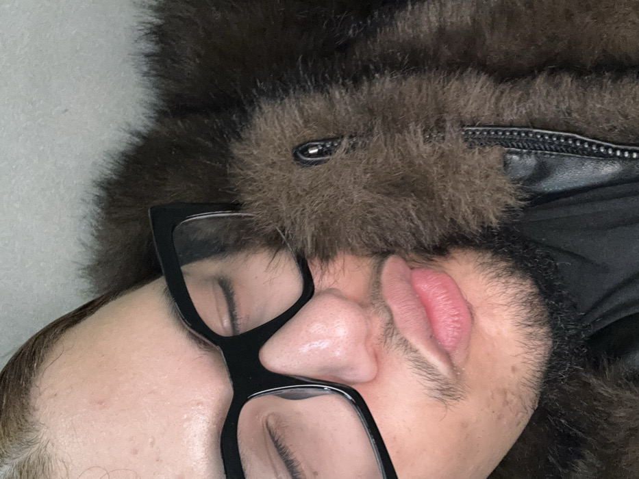 A close-up portrait depicts an adult individual with light brown hair pulled back, closed eyes, and a light stubble on the chin and upper lip. They are wearing thick, black-framed eyeglasses. Their lips are pursed. The individual is dressed in a dark inner garment, possibly black, underneath a dark brown fur-lined jacket. The jacket features a black zipper with a metallic pull and black leather-like material adjacent to the zipper. The fur collar of the jacket is positioned close to the individual's face. The background is an undifferentiated light grey surface, consistent with an indoor environment. The scene is situated in the city of Paris, France.