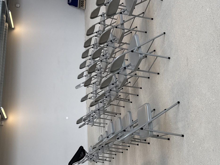 The image displays an empty indoor event space located in Montreuil, France. The room features a light gray concrete floor and plain white walls, illuminated by several linear industrial-style light fixtures mounted on the ceiling, where a ventilation duct is also visible on the right. Numerous gray metal folding chairs are arranged in orderly rows, forming an audience seating layout. Approximately 40 to 50 chairs are visible across multiple rows and columns. In the foreground, to the left, a black bag rests on the floor near the wall. In the far background, to the right, a partially visible blue item with white lettering, possibly reading "QATAR," is positioned on a dark, multi-compartment shelving unit. A small white square object is affixed to the central background wall. No individuals are present, and no actions or interactions are depicted.