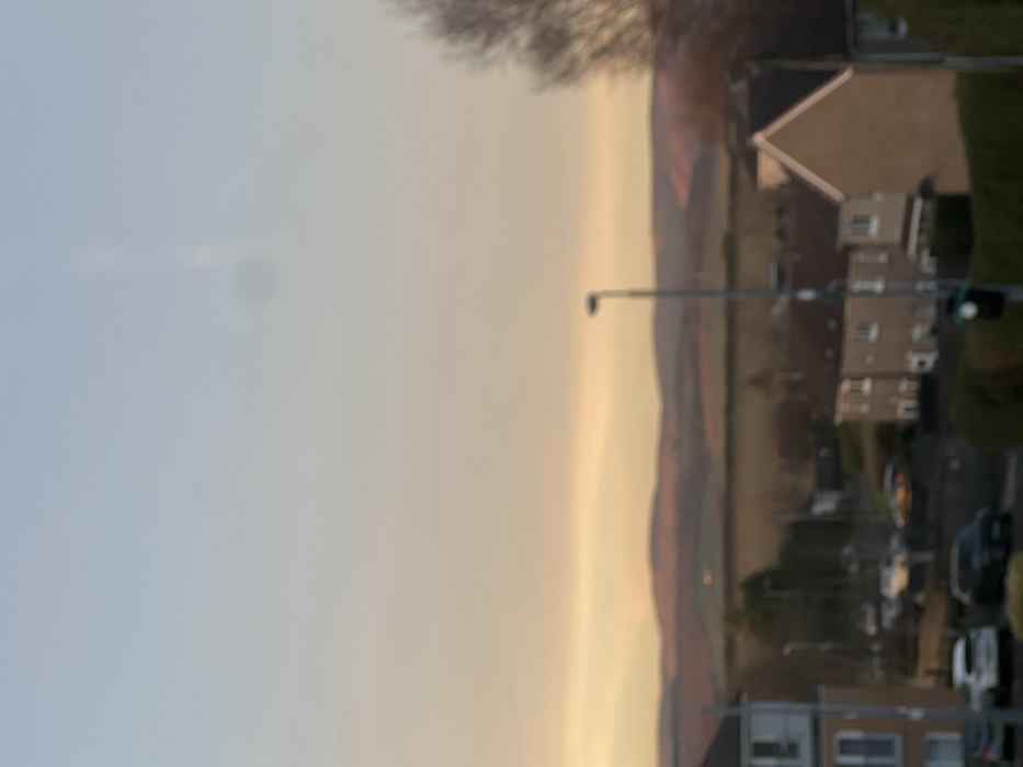 A hazy, vertically oriented landscape shows a sky transitioning from light blue to orange, with mountains in the distance. The foreground includes residential buildings and streetlights. The focus is soft, blurring details. Cars are parked along a street, and trees are sparsely visible. Overall, the scene evokes a calm, suburban atmosphere at either dusk or dawn.