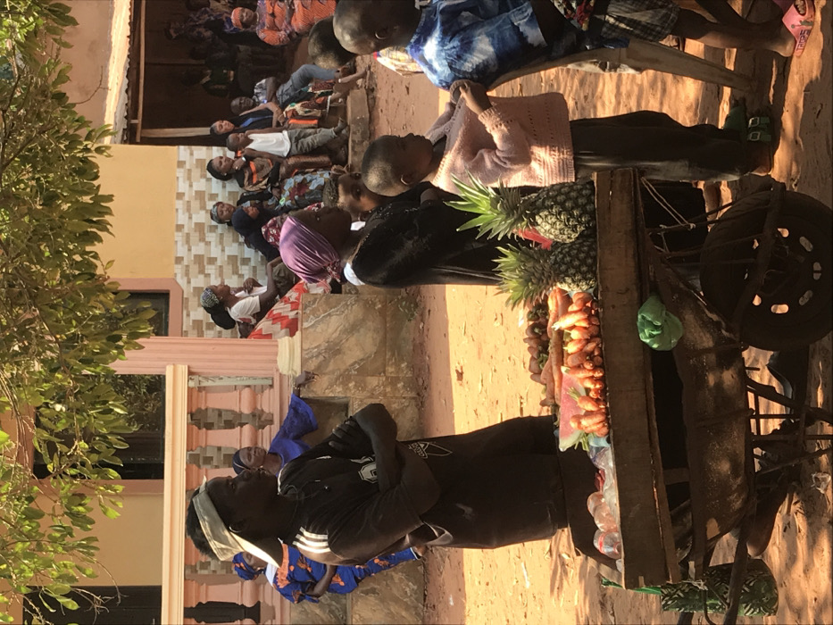 A fruit vendor stands by a wooden cart laden with pineapples, carrots, strawberries, and watermelons. People are sitting on chairs in front of a yellow building, while a child stands by the cart looking at the fruit. More people stand close by, including one in a blue patterned dress. A large tree partially obscures the left of the scene.
