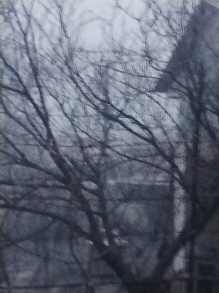 A monochrome image depicts bare tree branches against a gray sky