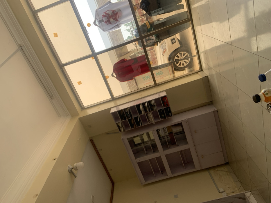 The image displays an interior room, located in Immigration Quarters, Nigeria, characterized by light yellow walls, a white ceiling with crown molding, and a light-colored tiled floor