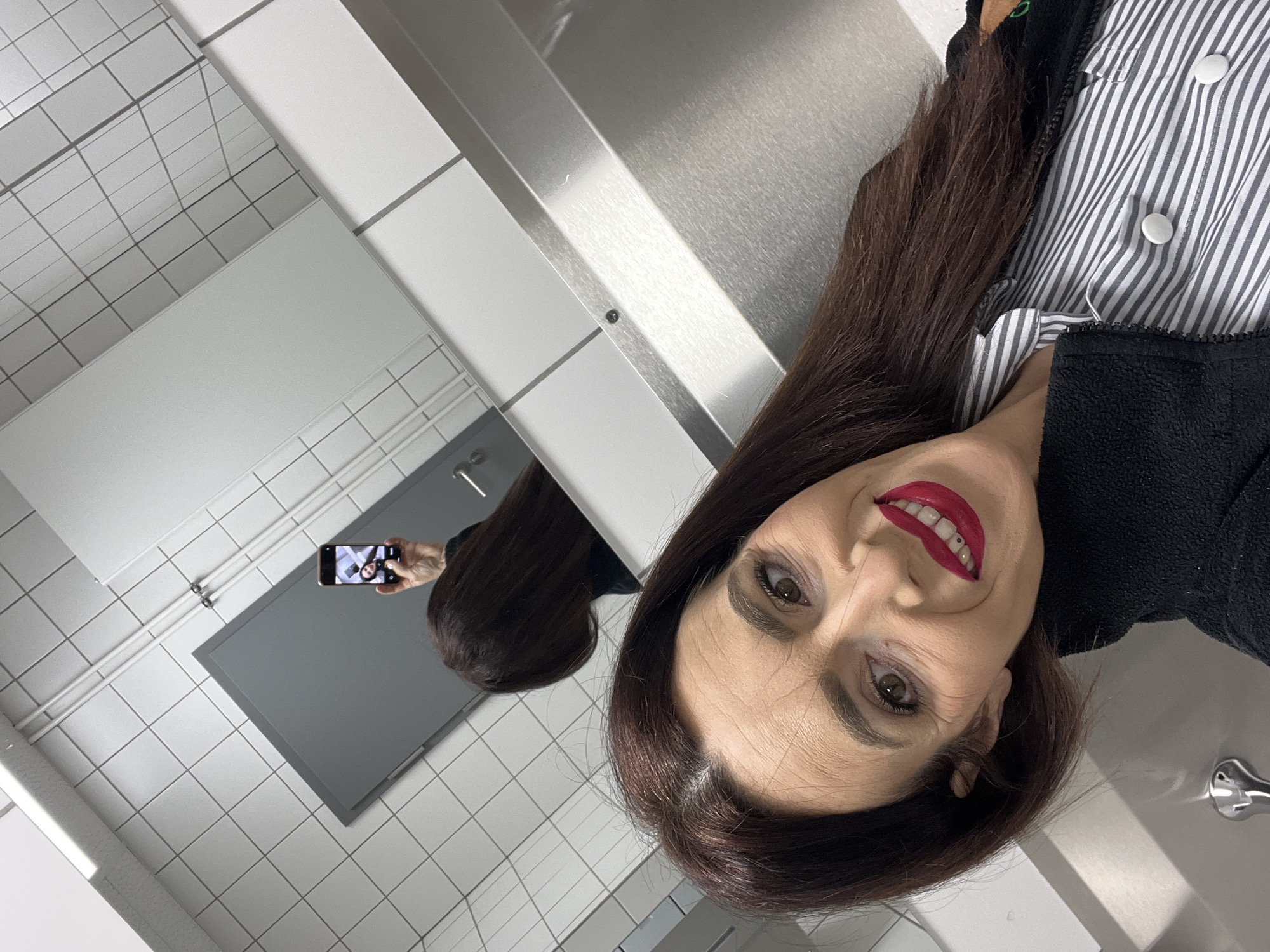 A woman is taking a selfie in a bathroom. The bathroom has white tile walls and a metal sink. The woman is wearing a striped shirt and a black jacket. She has long brown hair and is wearing red lipstick. The reflection of her holding the phone to take the picture is visible in the mirror. The location may be Mensdorf, Luxembourg, but this cannot be confirmed from the image.