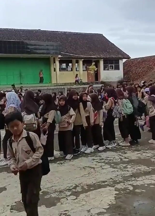 group of elementary school students, mostly girls, standing or walking in a schoolyard. They are wearing brown uniforms with hijabs, and many are carrying backpacks. The schoolyard is paved, with puddles of water, and the buildings around the yard appear to be typical school buildings with tile roofs. The sky is overcast. Students interact with each other, some walking in groups and some alone.