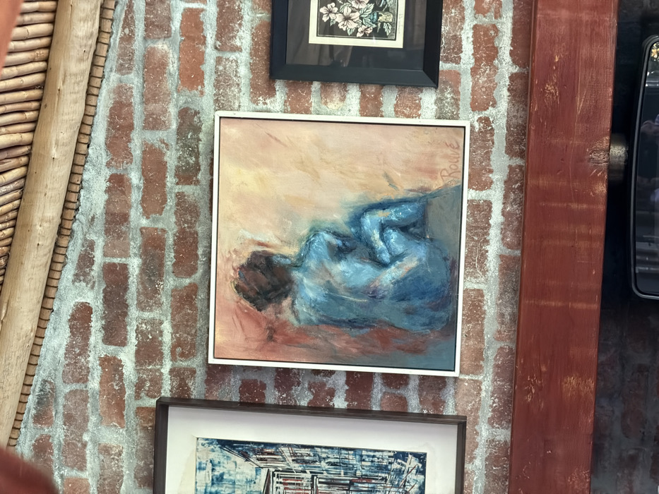 The scene depicts a section of an interior wall in Overstrand Nu, South Africa, featuring a reddish-brown brick pattern with light grey mortar. A prominent white-framed square canvas painting of a seated human figure, rendered in shades of blue with a muted reddish-orange and yellow background, occupies the central portion of the image. The signature "ROUVÉ" is visible in the lower right corner of this painting. To the left, a portion of a larger framed artwork, possibly a print, with a darker frame, displays an architectural scene predominantly in blue and white tones. To the right of the central painting, a smaller, dark-framed artwork features light pink flowers on a dark background. Below the artworks, a substantial reddish-brown wooden beam or mantle runs horizontally. Above the brick wall, a ceiling element constructed from light-colored, natural wood or bamboo-like rods is visible. No individuals are present, and no actions or interactions are depicted.
