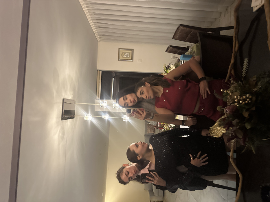 Three women pose closely together, reflected in a mirror. Two women are at the top, one in red and another in gray, taking a selfie with their phones. The third woman, below, wears a black sequined dress. Behind them, the reflection shows a contemporary interior with sheer curtains, a picture frame, a modern chandelier, dining chairs, and a decorative floral arrangement.