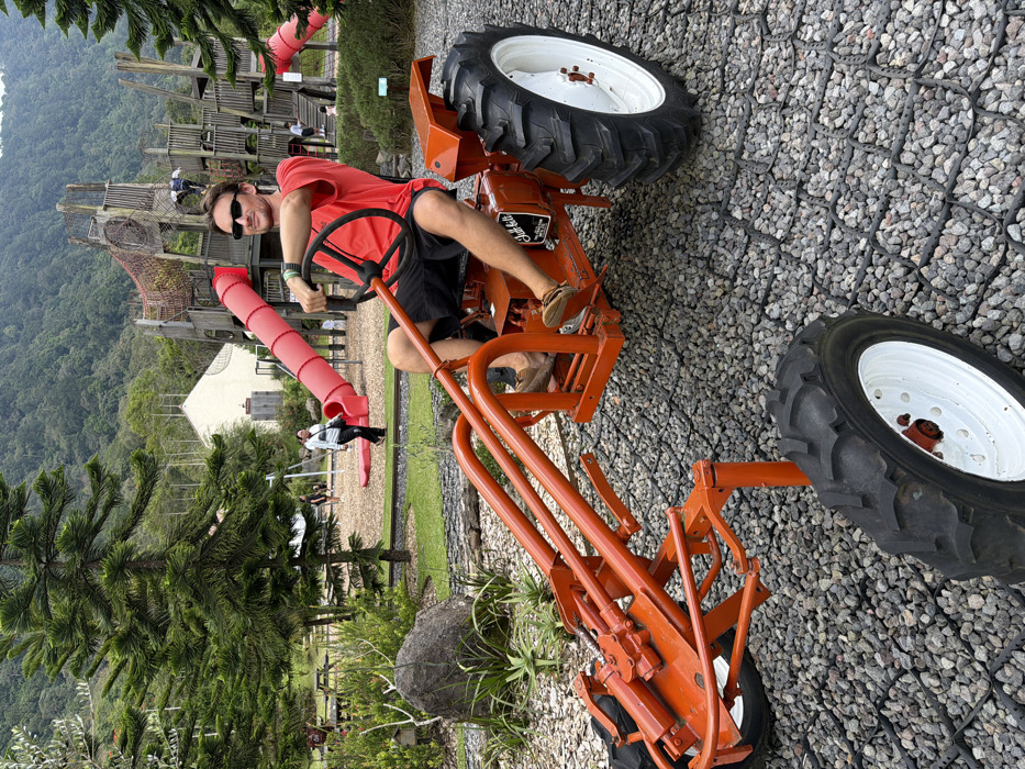 A man in sunglasses sits atop an orange tractor, smiling at the camera. The tractor is parked on a gravel surface next to a grassy area. In the background, there is a playground with a red slide and a tall wooden structure. Trees and mountains are visible in the distance.