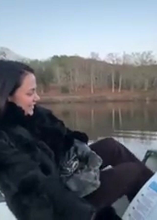 Two women are enjoying a pedal boat ride on a calm lake. The woman in the first shot wears a dark fur coat, brown pants, and gloves. She is looking towards the shore, which is lined with trees. The woman in the second shot is wearing a tan fur coat. The camera moves between the two women. The water reflects the sky and the trees.