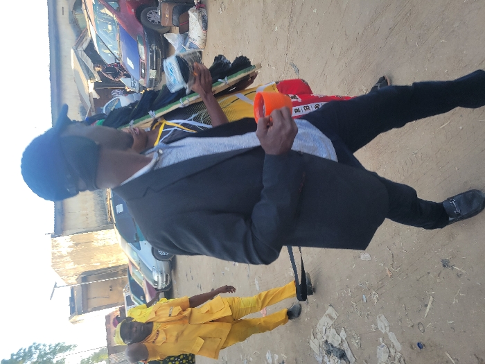 A person in a black suit and black hat holds up an orange cup. They are standing in a dirt lot with cars and buildings in the background. A person wearing a yellow uniform lies on the ground nearby. The first person appears to be using the cup as a megaphone, potentially addressing the person on the ground or others not visible in the frame. The scene seems to be taking place outdoors, possibly at a market or gathering.