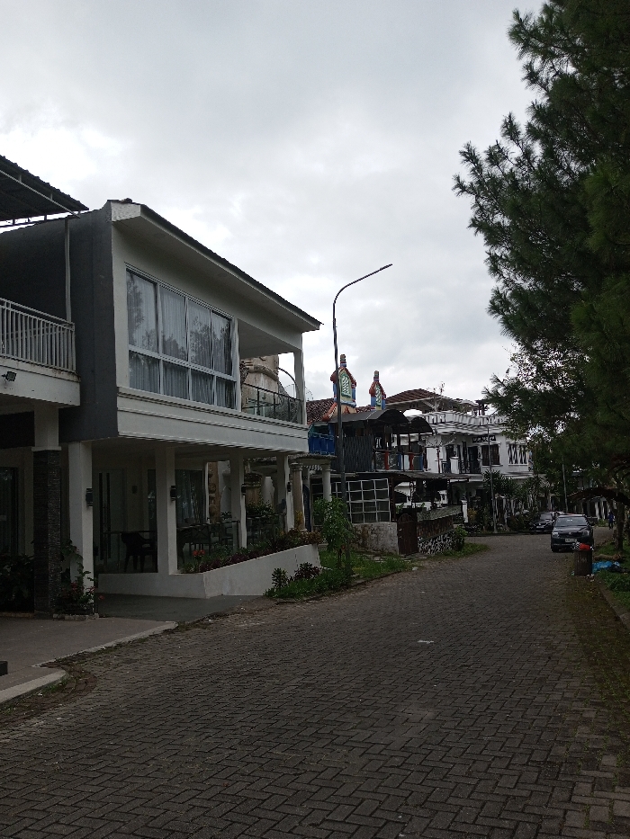 A residential street is lined with multi-story houses. The house on the left has white exterior, a balcony, and large windows. A street light stands beside a neighboring house with unique rooftop details. Paved street leads into the distance, with parked cars visible. A tall tree is on the right, and the sky is overcast.