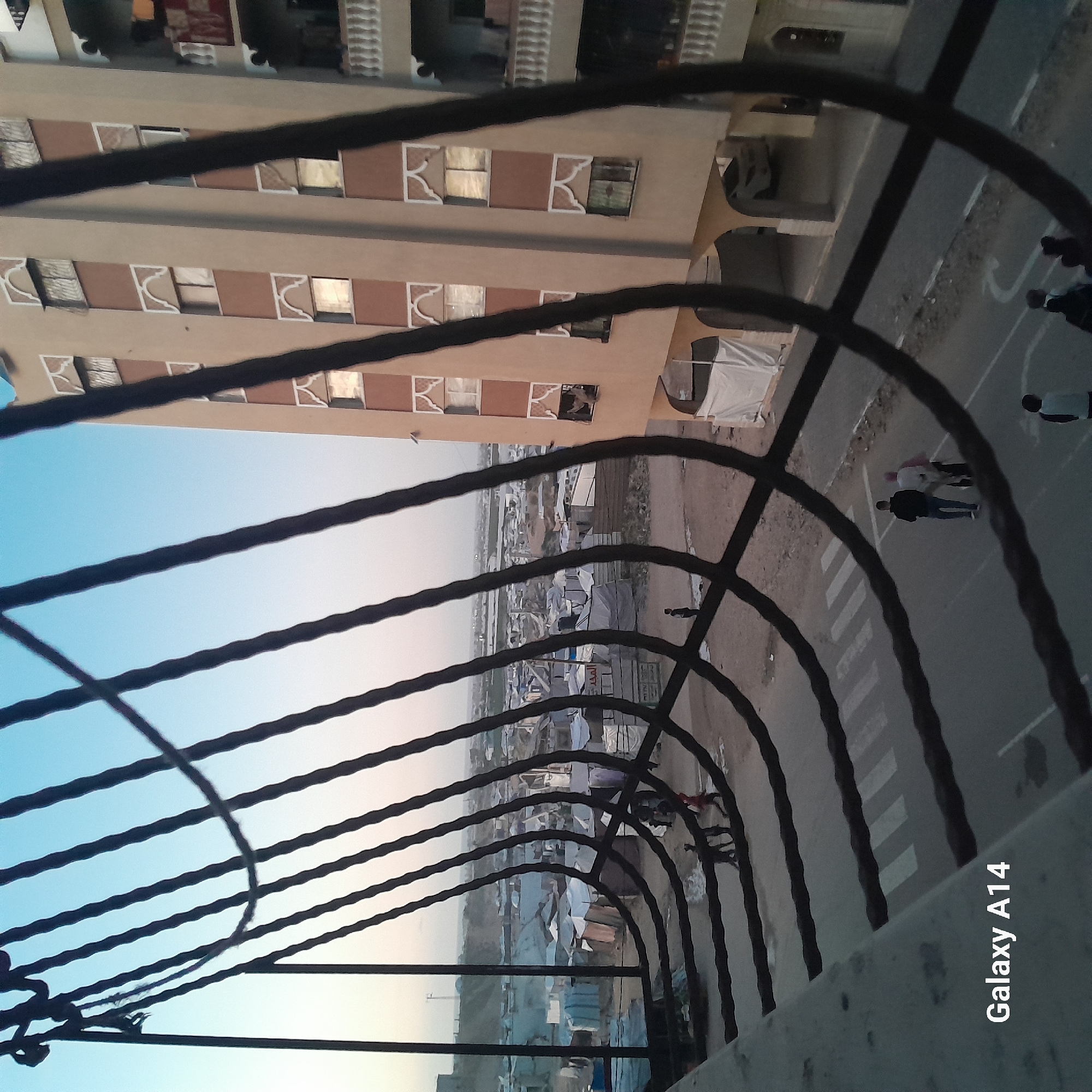 The image, taken from an elevated position, appears to show a view overlooking an urban area, possibly a camp or settlement, through a metal railing or fence. In the background, there are a number of temporary-looking structures or tents. A multi-story building is visible to the left, with a repeating pattern of windows. On the right, people are seen walking on a road with a pedestrian crossing. The photograph has a slight tilt, and the camera's watermark "Galaxy A14" is visible in the lower right corner. The location is identified as Khan Yunis, Palestinian Territory.