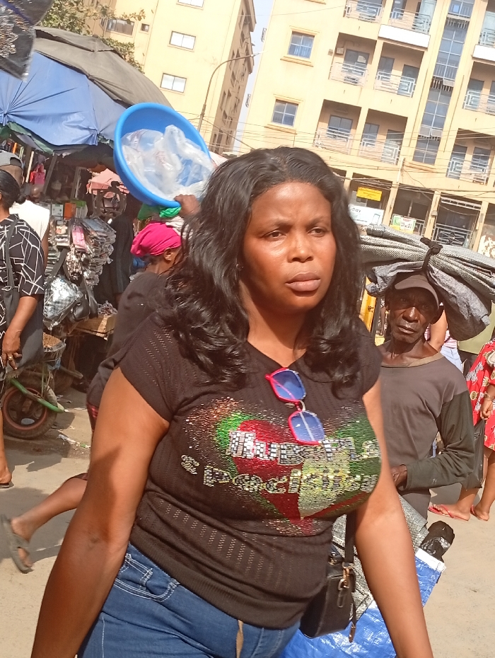 The image portrays an active outdoor street market in Fegge, Nigeria, under daylight conditions