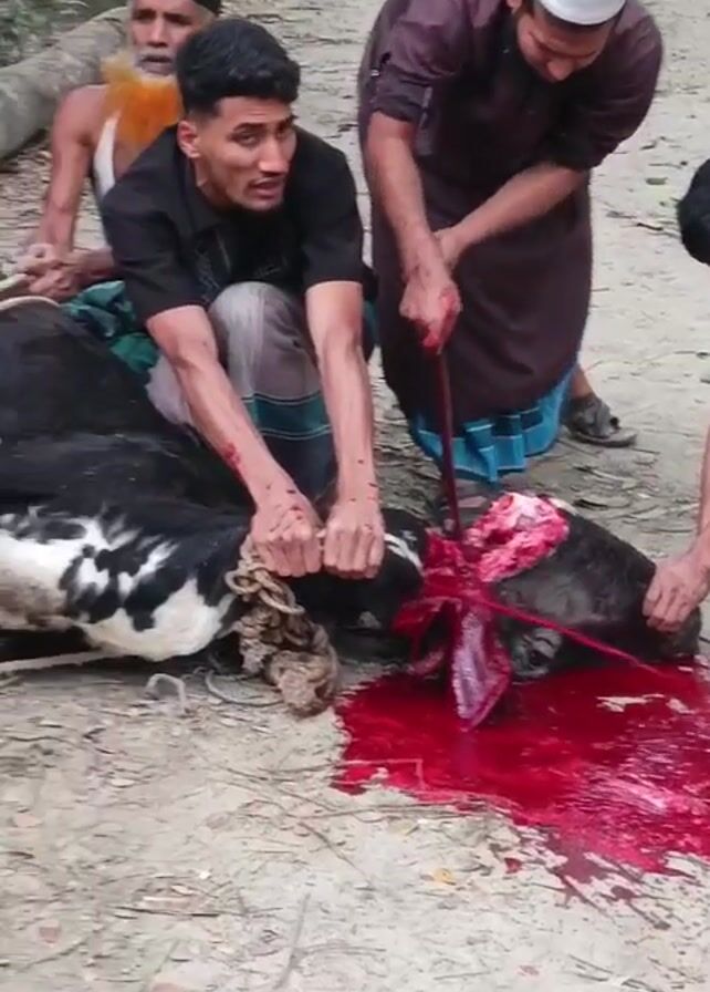three men beheading a cow. One man in a white hat is cutting into the cow's neck with a large knife, while the other two men hold the cow's head in place. There is a large pool of blood on the ground. Other men are holding down the cow's body. The environment appears to be a rural or village setting with dirt ground and vegetation in the background. The men are wearing casual clothing, some with traditional garments.