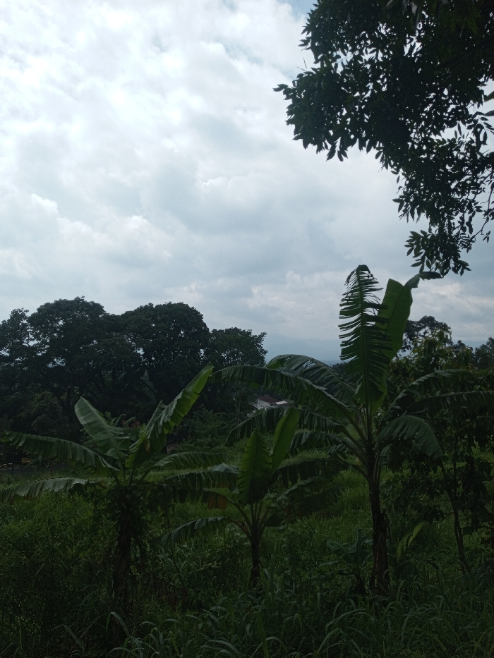Lush greenery dominates the scene under an overcast sky. Banana trees stand amidst tall grasses, their broad leaves a focal point. Dense trees fill the midground, obscuring the horizon. Hints of civilization, like a rooftop, are visible through the foliage. The top right corner is framed by tree branches, contrasting with the open expanse of the cloudy sky.