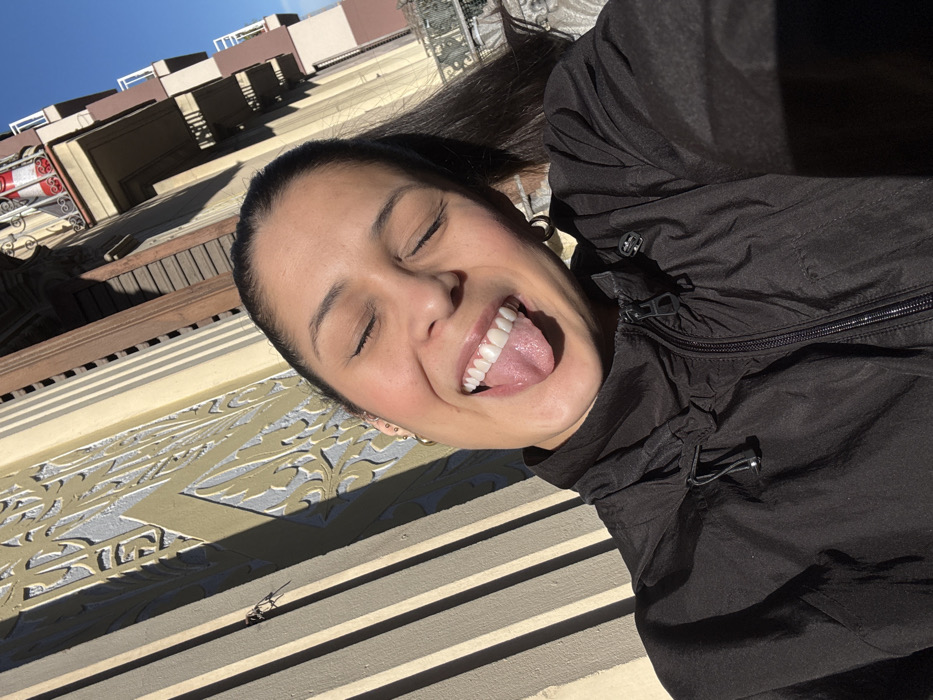 A young adult female is captured in a selfie, positioned with her head tilted at approximately 45 degrees