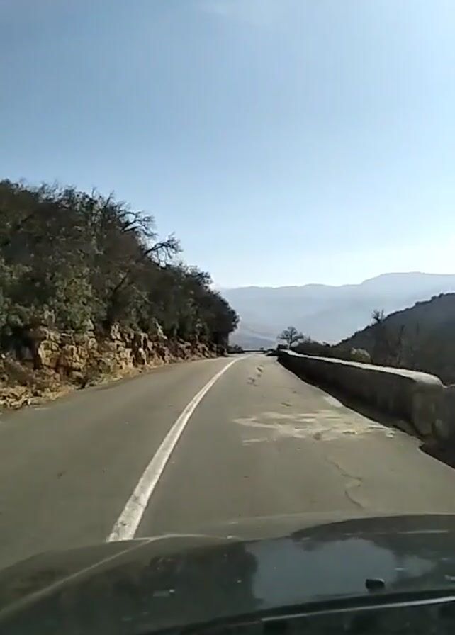 view from the driver's seat of a car moving along a two-lane road. The road has a single white line marking the center. On the left side of the road is a rocky hillside covered with trees. On the right side is a low stone wall. In the distance, mountains are visible under a clear, light blue sky. The hood of the car is visible at the bottom of the frame. The road appears to be winding slightly.