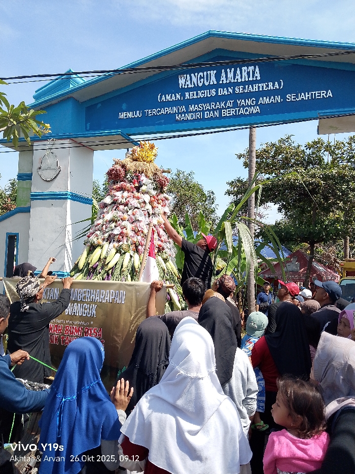 This image captures an outdoor community event in Wanguk, Indonesia, on October 26, 2025, at 09:12 AM. The primary subject is a large, conical offering structure, or "gunungan," composed of various agricultural products. The base consists of green corn cobs, followed by rows of small white bags, and strings of red onions, topped with golden fibrous material. An Indonesian flag is affixed to a support pole within the structure. A crowd of approximately 20-30 individuals, including men, women (many wearing hijabs), and a child, are gathered around the "gunungan." Several individuals are actively engaging with the structure; one man in a black shirt and red cap is reaching high towards its upper section. Multiple people hold a large brown banner with partially visible text, including "SUMBERHARAPAN WANGUK" and "BUMI DESA." The background features a prominent blue and white archway bearing the inscription "WANGUK AMARTA (AMAN, RELIGIUS DAN SEJAHTERA) MENUJU TERCAPAINYA MASYARAKAT YANG AMAN, SEJAHTERA MANDIRI DAN BERTAQWA." Beyond the crowd and structures, a clear blue sky, trees, and distant indistinct structures are visible.
