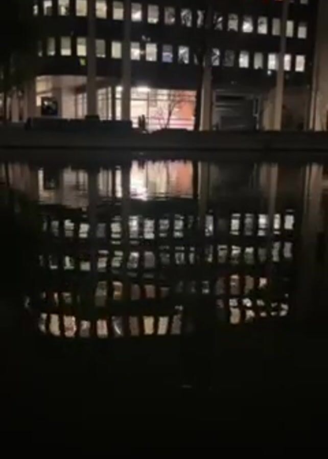 n office building reflected in a still body of water at night. The building is tall and has many lit windows. The water reflects the grid-like pattern of the windows, creating a distorted but recognizable image. The surroundings are dark, suggesting it is nighttime. A silhouette of a person can be seen in the distance in front of the building.