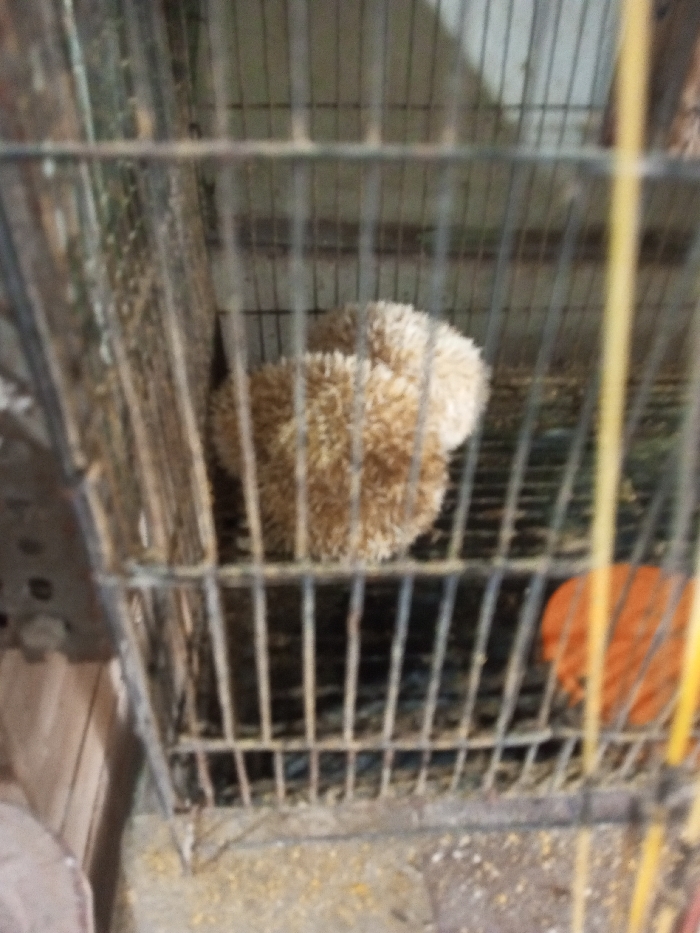 A wire cage contains two hedgehogs curled into balls. The hedgehogs appear light brown or tan with spines visible. Inside the cage there is a small orange feeding dish. The cage is old and slightly rusted. The floor of the cage appears dirty.